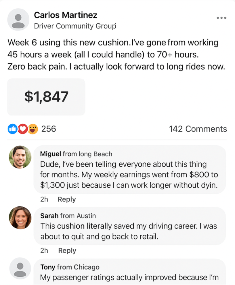 "This cushion literally saved my driving career. I was about to quit and go back to retail. Now I'm earning more than I ever did at my corporate job."